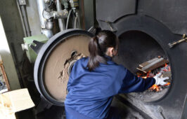 [写真/お湯を沸かすストーブにまきを入れる体験をする三浦さん ]