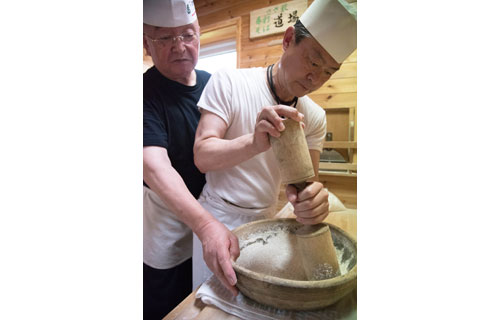 [写真/胴搗製粉を体験する平松さん(右)と指導に当たる小出さん ]
