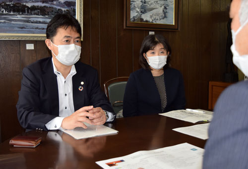 [写真/釧路、根室管内で支援する事業を説明する嵯峨山部長と赤渕次長(左から) ]