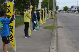 [写真/愛国小前の沿道に立ち、交通安全を呼び掛ける児童ら ]
