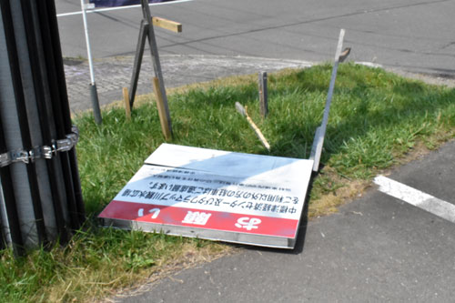[写真/脚部分が壊された看板 ]