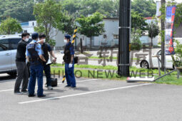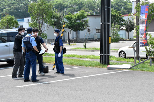 [写真/看板や水道メーターが壊された現場を捜査する警察官(19日午前10時7分、中標津町)=三村淳撮影 ]