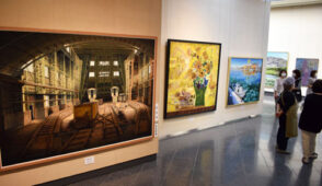[写真/入り口に展示した創設100周年記念賞「記憶をたどる」など、見応えある作品が並ぶ会場 ]