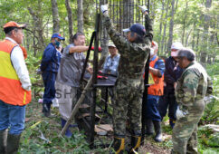 [写真/到着した箱わなを設置する関係者 ]