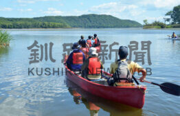[写真/塘路湖をカヌーで出発するツアーの一行 ]