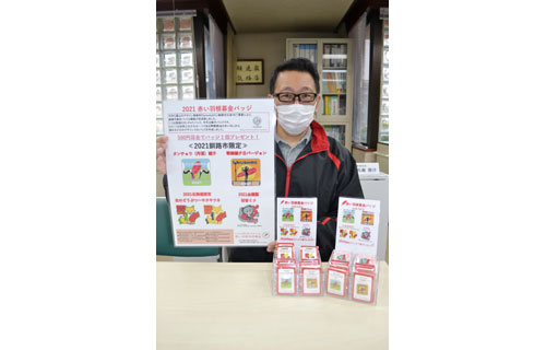 [写真/今年の赤い羽根募金バッジ ]