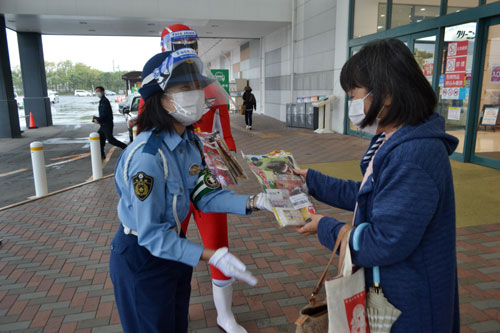 [写真/買い物客に交通安全を呼び掛ける警察官ら ]