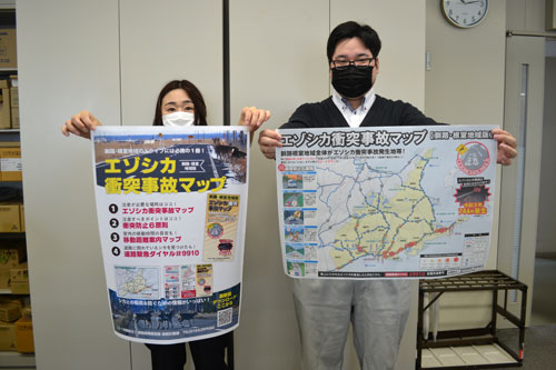 [写真/エゾシカ衝突事故マップを宣伝する釧路開建の職員 ]