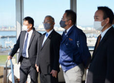 [写真/マリントポスくしろの展望室から漁場のある場所を確認し、説明を受ける横山参院議員(左から2人目) ]