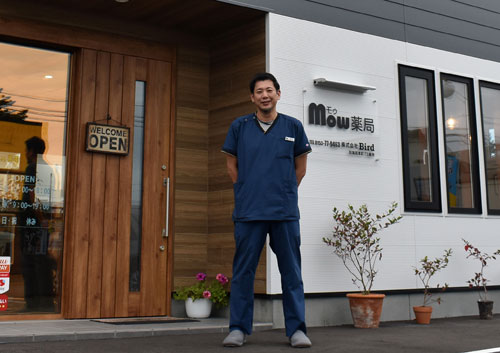[写真/別海病院の近くに開業したMow薬局の前で川嵜さん ]