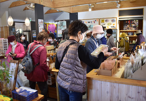 [写真/「ロ・バザール」で釧路町の特産品を購入するツアー客 ]