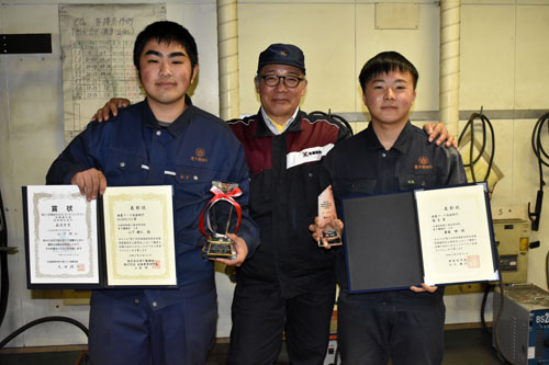 [写真/大瀧さん(中央)から頑張りをたたえられる山下さん(左)と齋藤さん ]