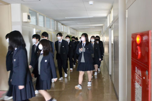 [写真/教師らの指示に従い、避難の練習をする生徒ら ]