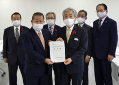 [写真/石倉局長(左)に要請書を手渡す浦本座長と関係4町長 ]