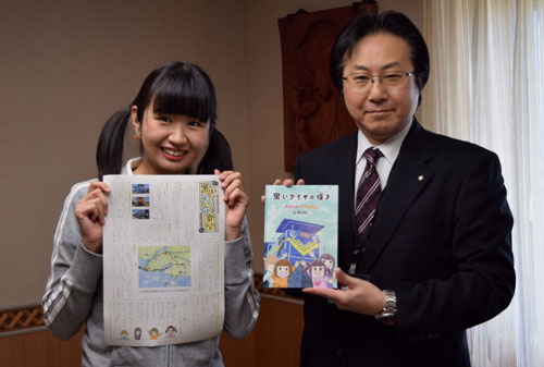 [写真/寄贈された絵本を手に高嶋館長(右)と、購入者特典で配布する壁新聞を持つ秋葉さん ]