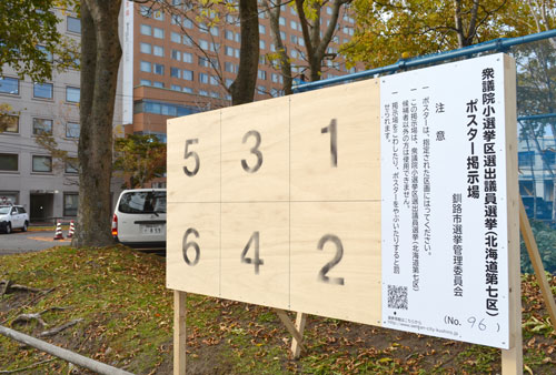 [写真/国道38号沿いの釧路市役所前にもすでにポスター掲示板が設置されている ]