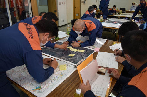 [写真/釧路川の氾濫を想定した図上訓練を行う参加者 ]