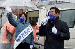 [写真/雨の中応援演説に駆け付けた勝部氏(右) ]