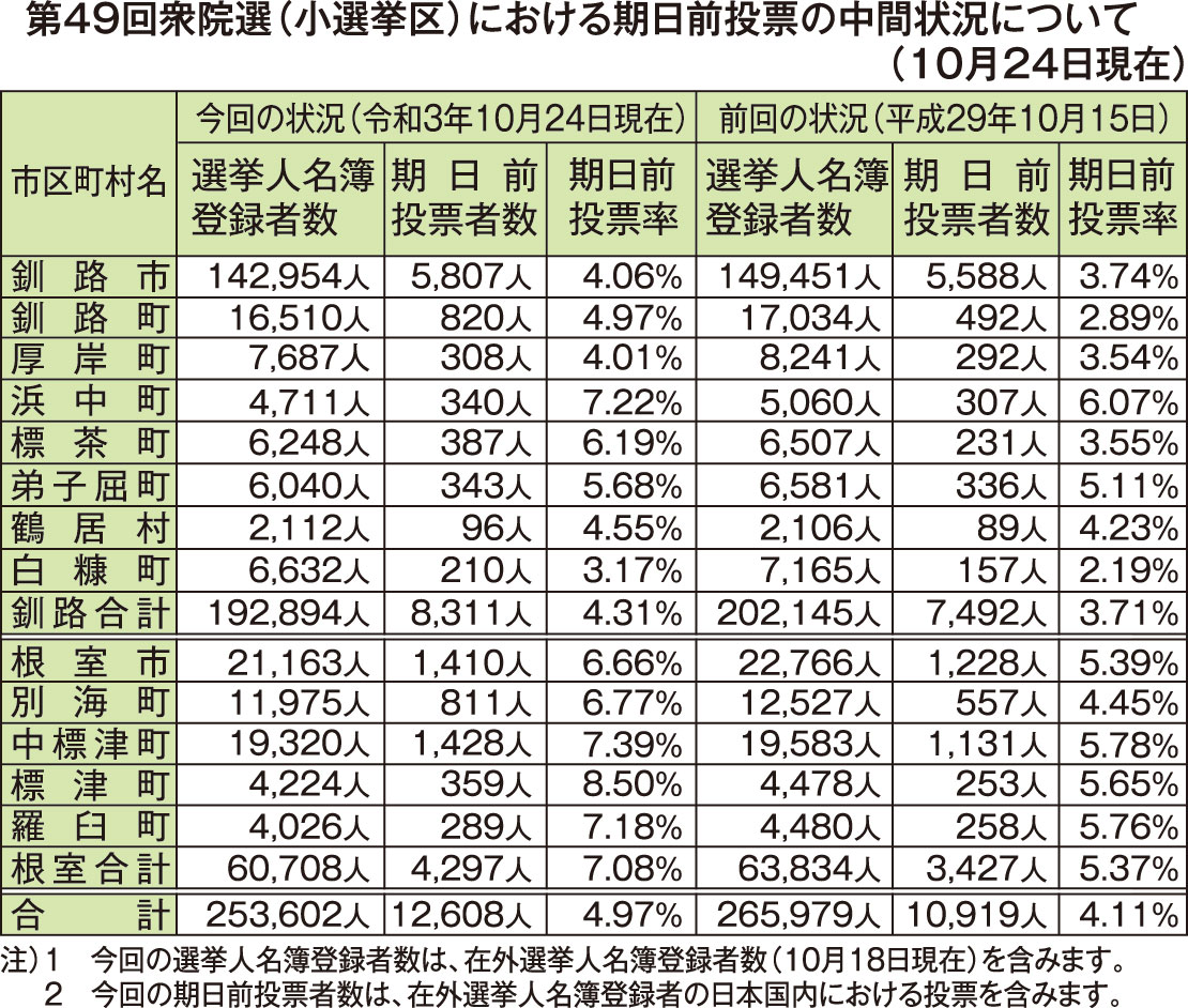 - 期日前、釧根最多1.2万人 密回避で上昇か(2021-10-26)