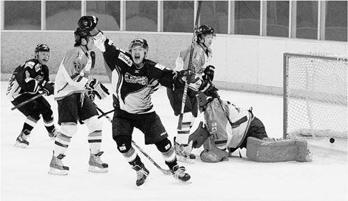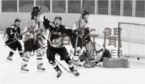 [写真/【日本製紙―東北】第3ピリオド12分にゴールを決め喜ぶDF梁取(中央) ]