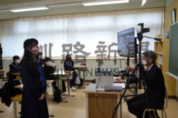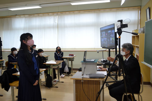 [写真/釧路市内の中学校4校をオンラインでつないだ授業で、講師に質問する桜が丘中の生徒 ]