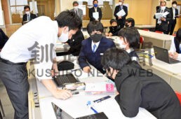 [写真/生徒の質問に対応する藤村教諭(左) ]