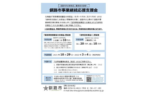 [写真/釧路市事業継続応援支援金のリーフレット。詳細は市商業労政課へ ]