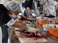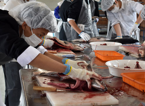 [写真/サケをさばく開成高の生徒 ]