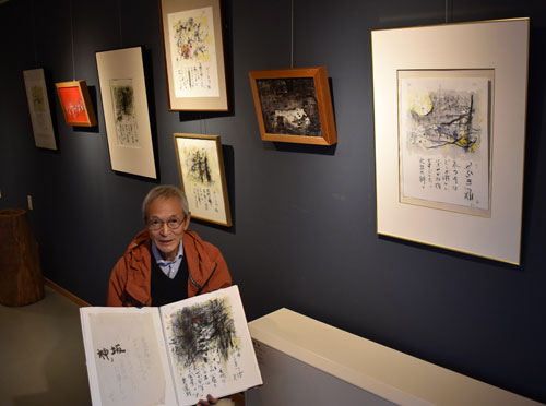 [写真/展示会場でスケッチを手にする深谷会長 ]