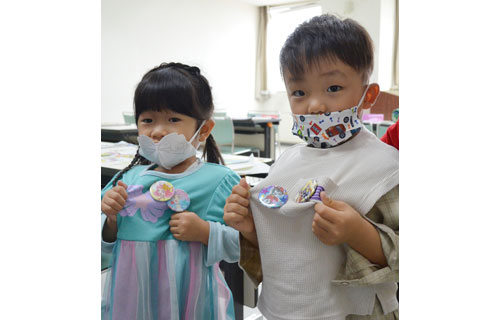 [写真/完成した缶バッジを胸に着けた子供たち ]