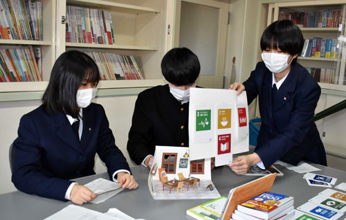 [写真/レイアウトの模型やSDGsのどの目標に該当する示しながら英語で発表する生徒 ]