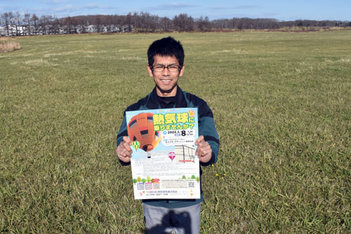 [写真/熱気球の飛行場所でポスターを手に参加や協力を呼び掛ける木嶋会長 ]