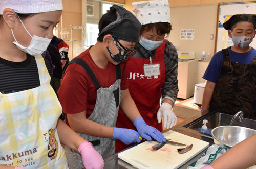 [写真/漁協女性部員(右から2番目)から指導受けマイワシを三枚に下ろす児童 ]