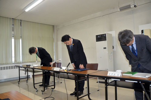 [写真/記者会見で謝罪する菅原局長(中) ]