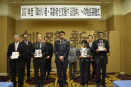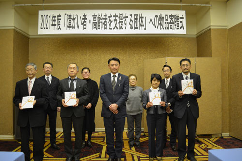 [写真/廣部会長(中央)と目録を受け取った4団体 ]