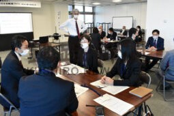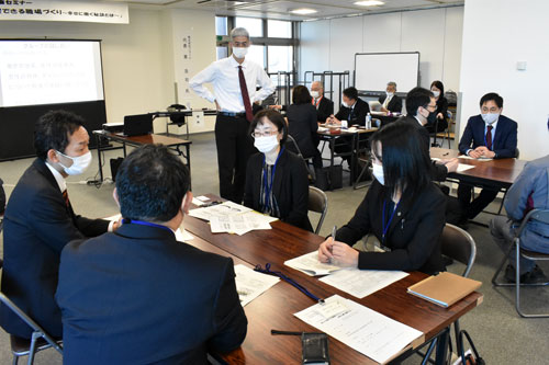 [写真/東さん(中央)が見守る中、職場で課題に感じることを話し合う参加者 ]