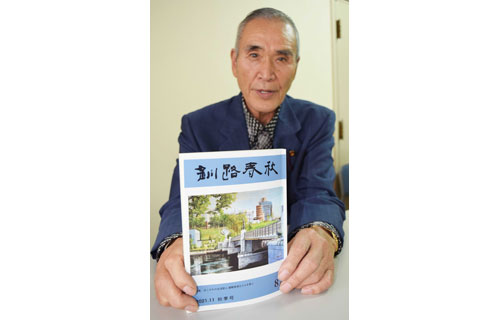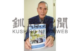 [写真/釧路春秋の最新刊を手に購入を呼び掛ける駒板会長 ]