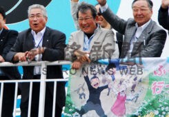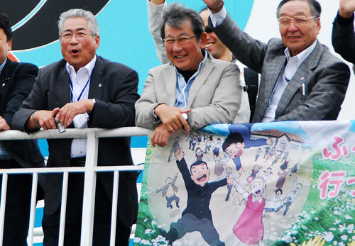 [写真/ジョバンニの島を基にした四島交流応援旗と色丹島へ向かう得能宏さん(左)と原作者の杉田成道さん(中央)=2015年8月 ]