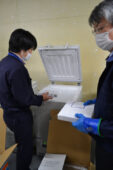 [写真/市役所防災庁舎内のディープフリーザーにワクチンを収容する市職員(19日正午前) ]