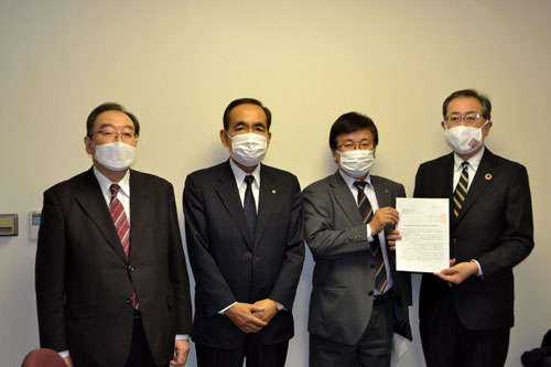 [写真/北洋銀行の織田常務(右)に要請書を渡した福田委員長(右から2人目) ]