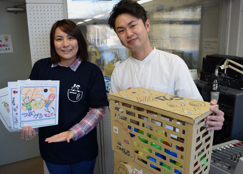 [写真/自作ガチャガチャや寄せられたイラストを手に来場を呼び掛ける同局スタッフ ]