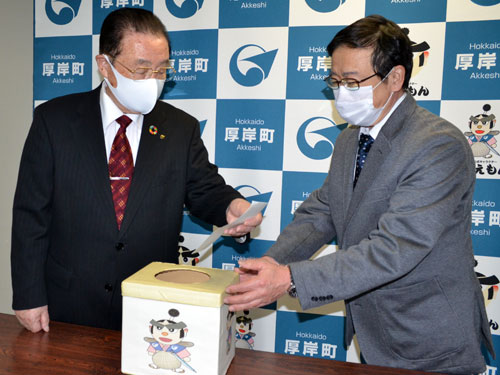 [写真/抽選する若狭町長(左) ]