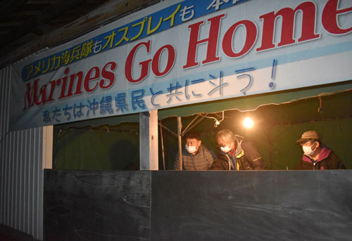 [写真/演習場内私有地で夜間監視に向け準備する反対派のメンバー(5日午後6時30分ごろ) ]