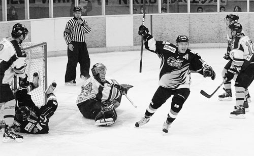 [写真/【日本製紙丨栃木日光】第1ピリオド2分日本製紙、ゴール前の混戦からFW飯村が押し込んで2点目を決め手を上げて喜ぶ ]