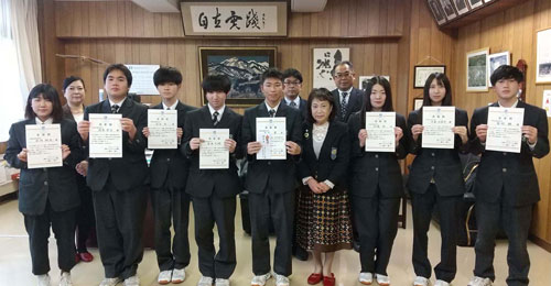 [写真/表彰状を手渡した白糠高校の生徒たちとともに記念撮影する橋口会長(前列右から4人目) ]