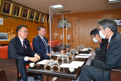 [写真/蝦名市長に協力を要請した斎藤委員長と畑中副委員長(左から) ]