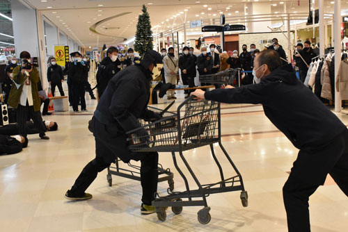 [写真/刃物を持った犯人役をカートでけん制する参加者 ]