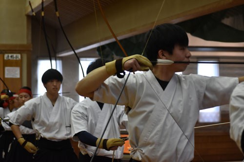 [写真/真剣な表情で弓を引く選手 ]