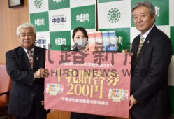 [写真/中標津町内の小中学生1945人に400円分の牛乳券を配り、消費拡大を訴える高橋組合長(左) ]