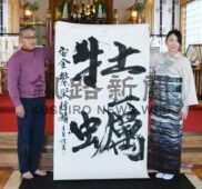 [写真/揮毫した内海さん(右)と中嶋代表取締役 ]